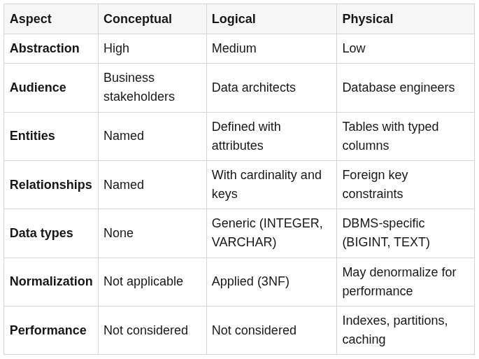 Audit your current data platform against all three levels. Can you show a business stakeholder what entities your system tracks (conceptual)? Can you show an architect the precise attributes and relationships (logical)? Can you explain why the tables are partitioned and indexed the way they are (physical)?