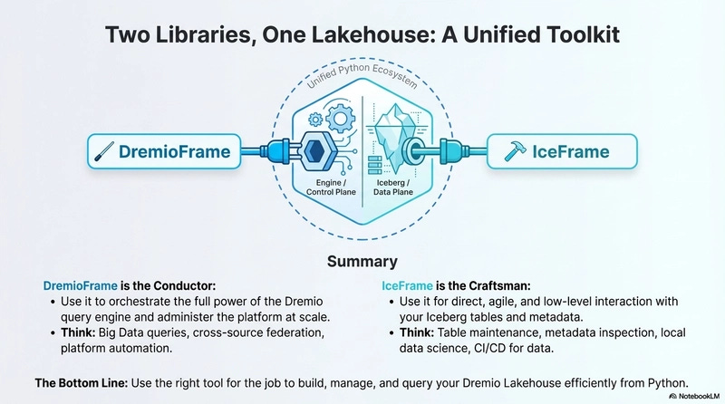 These examples show the contrast. DremioFrame works with the Dremio catalog. IceFrame works with Iceberg storage. When used together, they give you a complete path from data creation to query.