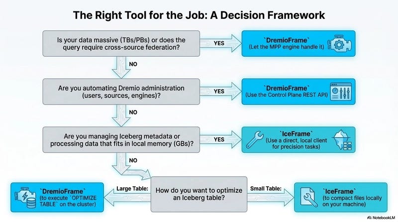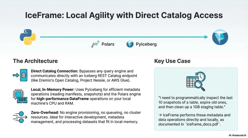 A simple pattern looks like this. You can write to and manage lightweight Iceberg tables using iceframe for local processing, and use dremioframe to work with Dremio for extensive data processing and query federation with databases/lakes/warehouses, and to curate a semantic and governance layer on top of your data.
