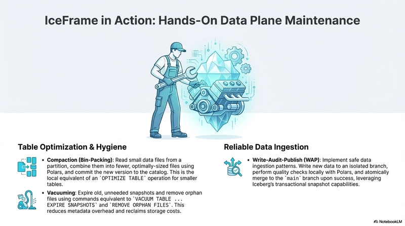 IceFrame gives you a focused set of tools for Iceberg tables. You can compact files, evolve partitions, and run maintenance tasks with short commands.