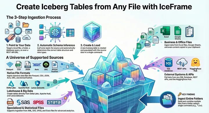 df_historical = ice.read_table(”products”, snapshot_id=123456789012345)5. Ingesting Data from External Files