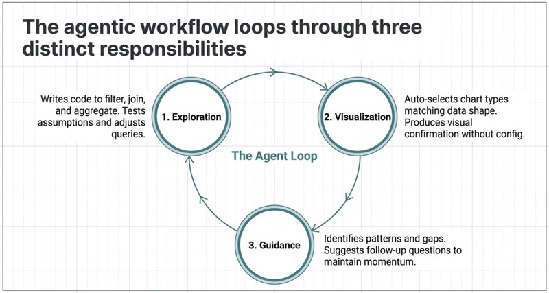 The first responsibility of the agent is data exploration. It writes SQL or code to filter, join, and aggregate datasets. It tests assumptions and adjusts queries based on results. This mirrors how an analyst works but happens automatically.