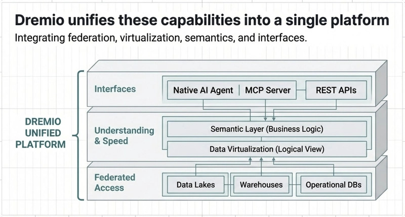 Dremio provides a platform designed for agentic analytics at scale. It brings federation, virtualization, semantics, and agent interfaces into one system.